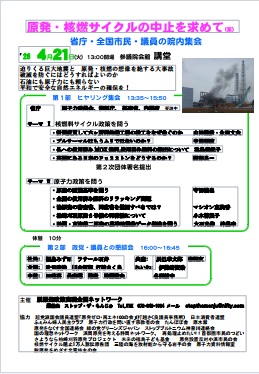 第1部 基調講演 13:20~13:50 第2部 ヒヤリング集会 13:50~15:20 [テ ー マ] Ⅰ 余剰プルトニウムをどう削減するのか Ⅱ 重大事故のリスクを隠蔽し、なぜ再処理を続けるのか Ⅲ 核燃料サイクルの総事業費について Ⅳ 事故時の避難計画について 第3部 政党との懇談会 16:10~16:40 |
